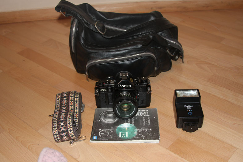 Canon A-1 + 50mm 1.8, მოყვება ფლეში და ტყავის ჩანთა